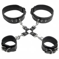 Σετ δεσίματος από δέρμα και υλικά άριστης ποιότητος και αντοχής. Αποτελείται από 2 χειροπέδες για τα χέρια και 2 για τα πόδια. Είναι κατασκευασμένες από διπλό δέρμα φάρδους 6 cm και μήκους 28 cm για τα χέρια και με μήκος 32 cm για τα πόδια. Οι χειροπέδες είναι ανεξάρτητες και αποσπώμενες και μπορούν να χρησιμοποιηθούν όπου εσείς θέλετε. Υπάρχει και ένα αξεσουάρ που μπορεί να ενώσει και τις 4 χειροπέδες που αποτελείται από έναν κρίκο με 4 λουράκια σε σχήμα σταυρού και με κρικάκια στο τελείωμα.