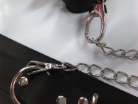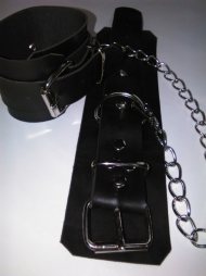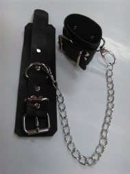 Α) Δύο ζευγάρια χειροπέδες ανεξάρτητες και αποσπώμενες, για χέρια και πόδια. Είναι με διπλό δέρμα φάρδους 6 cm και συνολικού μήκους 32 cm η καθεμία. Διαθέτει και έξτρα αλυσίδα 30 cm για περισσότερες επιλογές στα δεσίματα σας.