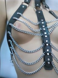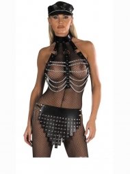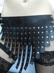 Γυναικείο σύνολο που περιλαμβάνει ένα αξεσουάρ για το στήθος και μια φούστα. Είναι από δέρμα και υλικά άριστης ποιότητος και αντοχής. Το αξεσουάρ για το στήθος διαθέτει περιλαίμιο από όπου ξεκινάνε τα 3 λουριά. Τα λουριά ενώνονται μεταξύ τους διαδοχικά σε διαφορετικός αποστάσεις και σχηματίζουν ένα όμορφο περίγυρο γύρω από το στήθος. Στην φούστα έχει 15 λωρίδες φάρδους 2 cm και είναι διακοσμημένες με ασημένια τρουκς. Πολύ εντυπωσιακή και πρωτότυπη γραμμή για να τον εκπλήξετε.