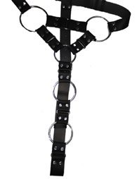 Γυναικείο κορμάκι από δέρμα και υλικά άριστης ποιότητος και αντοχής. Έχει δυο μεταλλικούς κρίκους για τα στήθη διαμέτρου 9 cm και ένα κάθετο λουρί φάρδους 3 cm. Το λουρί είναι ενωμένο με 3 μεταλλικούς κρίκους διαμέτρου 5,5 cm και συνεχίζει στην πλάτη με ρυθμιζόμενο τόκα.