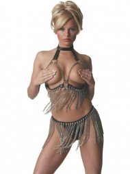 Γυναικείο σύνολο που περιλαμβάνει ένα σουτιέν και ένα στρινγκ από δέρμα και άλικα άριστης ποιότητος και αντοχής. Το σουτιέν έχει ένα περιλαίμιο από το οποίο ξεκινούν 2 λουριά για να πιάσουν τον στηθόδεσμο με φάρδος 2,5 cm. Το στήθος το αγκαλιάζουν 2 αλυσίδες που καταλήγουν σε δερμάτινη λωρίδα γεμάτη με αλυσίδες διαφορετικού μεγέθους. Το στρινγκ έχει μια ενσωματωμένη ζώνη που διακοσμείται με κρεμαστές αλυσίδες σαν φούστα. Ένα πανέμορφο και λαμπερό γυναικείο αξεσουάρ στο σώμα σας. Η ζώνη και το δέρμα στο στήθος είναι από χοντρό δέρμα.