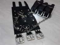 Μαύρες δερμάτινες χειροπέδες με διπλή τόκα που είναι ανεξάρτητες και αποσπώμενες. Έχουν πλάτος 12 cm και συνολικό μήκος 32 cm, έτσι ώστε να ταιριάζει στα χέρια και στα πόδια. Διαθέτει 3 λουριά με 3 τόκες για καλύτερο και πιο γεμάτο δέσιμο. Έχει συνδετικό γάντζο και έξτρα αλυσίδα μήκους 30 cm για περισσότερες εναλλακτικές επιλογές στα ερωτικά σας παιχνίδια.