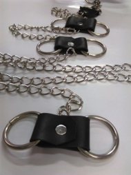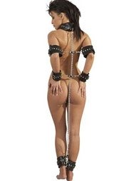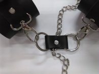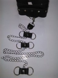 Σετ δεσίματος από δέρμα και υλικά άριστης ποιότητος και αντοχής. Ένα πολυδιάστατο και ολοκληρωμένο σετ για πολλά και ατελείωτα δεσίματα. Αποτελείται από 6 χειροπέδες φάρδους 7 cm, με διπλό δέρμα και διακοσμητικά ασημένια τρουκς σε όλη την επιφάνεια. Η κάθε χειροπέδα διαθέτει συνδετικούς γάντζους. Οι χειροπέδες είναι ανεξάρτητες και αποσπώμενες και είναι για το μπράτσο, τον καρπό και τα πόδια. Διαθέτει φαρδύ περιλαίμιο και αλυσίδα που ξεκινά από το περιλαίμιο, φτάνει μέχρι τα πόδια και έχει συνδετικούς κρίκους στην πλάτη, στην μέση και κάτω στα πόδια για να μπορούν να πιαστούν οι χειροπέδες από πίσω ή από μπροστά αναλόγως με το τι επιθυμείτε. Μπορείτε να κάνετε πολλές εναλλαγές στα ερωτικά σας δεσίματα αφού κάθε κομμάτι είναι ανεξάρτητο.