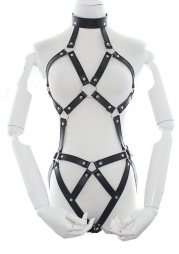 Δερμάτινο γυναικείο κορμάκι. Περιλαμβάνει ένα περιλαίμιο, τα λουριά έχουν φάρδος 2,5cm και ενώνονται με μεταλλικούς κρίκους.