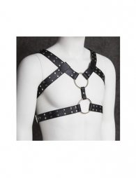 Ανδρικό δερμάτινο αξεσουάρ στήθους με 2 κεντρικούς μεγάλους μεταλλικούς κρίκους, με ενωμένα λουράκια φάρδους 4 cm και με 2 σειρές με διακοσμητικά τρουκς. Ένα ανδρικό αξεσουάρ που θα σας δώσει δυναμισμό στην εμφάνισή σας.