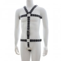 BDSM Δερμάτινο ανδρικό κορμάκι. Διαθέτει λουριά φάρδους 3 cm που διακοσμημένα σε όλη την επιφάνειά τους με τρουκς. Διαθέτει έναν κεντρικό μεταλλικό κρίκο όπου ενώνονται 4 λουριά στο στήθος με προσαρμοζόμενες τόκες. Ένα κάθετο λουρί με τόκα που καταλήγει σε έναν μεταλλικό κρίκο πέους και σε μια ζώνη. Ένα όμορφο αξεσουάρ για ανδρικό σώμα εμπλουτισμένο με ασημί τρουκς. Δώστε νέα δυναμική στην εμφάνισή σας. Είναι one size.