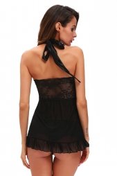 Μαύρο babydoll με διαφάνεια και δαντέλα που συνδυάζεται με ασορτί g στρινγκ. Έχει σατέν κορδέλες που δένουν στον λαιμό, στο στήθος διακοσμείται με έναν μεγάλο φιόγκο και έχει άνοιγμα από μπροστά τονίζοντας την σεξουαλικότητα του στρινγκ. Η ύφανση του έχει πολυέστερ και σπάντεξ.
