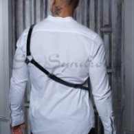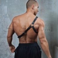 BDSM Δερμάτινο αντρικό αξεσουάρ με χιαστή λουράκι. Το λουρί έχει φάρδος 3 cm και είναι ενωμένο με έναν μεταλλικό κρίκο που πηγαίνει γύρω από τον ένα ώμο. Απλό αξεσουάρ που παραπέμπει σε άλλες ερωτικές καταστάσεις!