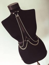 BDSM Δερμάτινο γυναικείο τοπ με διακοσμητικές αλυσίδες. Διαθέτει περιλαίμιο με κρίκο και κάθετο λουρί φάρδους 2 cm με κατάληξη σε κρίκοπου είναι στην μέση. Δύο διακοσμητικές αλυσίδες που ξεκινούν από το λαιμό και καταλήγουν στα πλάγια και δύο από τη μέση με κατάληξη επίσης στο ίδιο μέρος. Σας ομορφαίνει για τις "άγριες στιγμές σας"!