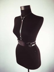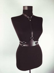 BDSM Δερμάτινο γυναικείο τοπ. Διαθέτει περιλαίμιο με μεταλλικό κρίκο στο κέντρο. Ένα κάθετο λουρί φάρδους 2 cm με κατάληξη στη μέση σε τριγωνικό σχέδιο και με δύο δεσίματα στη μέση. Όμορφο αξεσουάρ στο κορμί σας για πιο ιδιαίτερες εμφανίσεις!