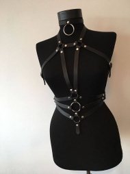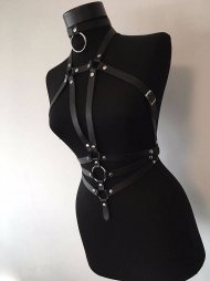 BDSM Δερμάτινο γυναικείο τοπ. Διαθέτει περιλαίμιο με μεταλλικό κρίκο και δύο κάθετα λουριά φάρδους 2 cm. Έχει ένωση πάνω από το στήθος, ζώνη με 3 μεταλλικούς κρίκους και 3 λουριά που ενώνονται στα πλάγια. Ένα αξεσουάρ στο κορμί σας για τα φετιχιστικά σας παιχνίδια.