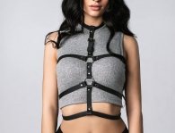 BDSM Δερμάτινο γυναικείο τοπ με περιλαίμιο. Το περιλαίμιο και τα 3 οριζόντια λουριά ενώνονται με ένα κεντρικό κάθετο λουρί φάρδους 2 cm. Μπορείτε να το φορέσετε ακόμη και σε μια έξοδο σας πάνω από τα ρούχα! Για αυτούς που ακολουθούν την μόδα!