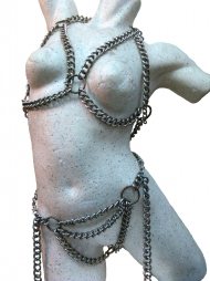 BDSM Γυναικείο σύνολο από χοντρές και ελαφριές αλυσίδες που περιλαμβάνει σουτιέν και στρινγκ. Οι αλυσίδες ενώνονται με κρίκους και το σύνολο κλείνει με γάντζους. Εντυπωσιακό, πρωτότυπο και δυναμικό σύνολο για φετιχιστικές στιγμές! Είναι one size.