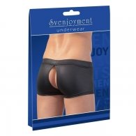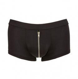 Black pants for him with open buttocks and zip in the front and stitched hem.