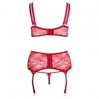 Σετ 3 κομματια - Μεγάλο μέγεθος XL Σαγηνευτικά προκλητικό Cottelli Plus Size Δαντελένιο Κόκκινο σετ Ζαρτιέρα με ασορτι ανοιχτό στρινγκ και σουτιεν 3- Piece Extremely seductive red lingerie set for ladies with curvy figure. This sexy floral lace set includes an underwired bra with bones at the sides, a suspender belt with decorative lacing at the front and a crotchless string. The cups with lacing and their straps can be removed completely (unbuttoned) so that only a shelf bra with slightly padded cups and a pair of straps is left. The bra and suspender belt have gold-coloured details and hook-fasteners at the back. The 2 pairs of bra straps and the suspender straps are adjustable.