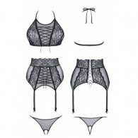 The set is complemented with an “open space” thong made of black, delicate mesh.