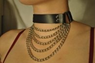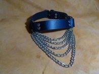 Περιλαίμιο απο συνθετικο δέρμα και υλίκά, αριστης ποιότητος και αντοχης. Περιλαιμιο με λουρακι φαρδους 3cm, 2 μεταλικους κρικους στα πλάγια που κρεμονται 5 διαφορετικου μεγεθους διακοσμητικές αλυσίδες.