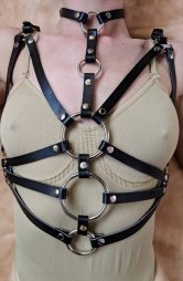 leather women απο οργανικο δερμα και υλικα, αριστης ποιοτητος και αντοχης. Αξεσουάρ στηθους, ιδιαιτερο, μοναδικο με μεγαλους μεταλικους κρικους, φαρδους 5cm, στη μεση του στηθους, ενωμενα με λουρακια φαρδους 2cm. Διαθετει και λαιμοδετη. Ενα πολυ εντυπωσιακο αξεσουαρ σατο κορμι σας που θα προκαλεσει και θα εντυπωσιασει.