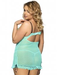 Babydoll σε πράσινη απόχρωση με μαύρες λεπτομέρειες, με ασορτί g στρινγκ και με ζαρτιέρες, Queen Size Green Floral Babydoll With G string. Έχει μπαλένες, ρυθμιζόμενες τιράντες και κουμπώνει στην πλάτη. Στο στήθος και κατά μήκος της κοιλιάς έχει δαντελένιες λεπτομέρειες ενώ το υπόλοιπο είναι διαφανές με πουά σχέδιο. Είναι σε XL μέγεθος.