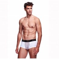 High quality spandex white boxer from Envy. Comfortable even for long day wear and sexy enough for seductive nights. White boxer with sheer mesh pouch and black waistband.