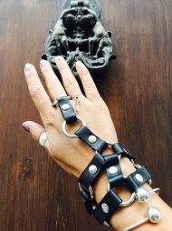 Δερμάτινα αξεσουάρ χεριού με 2 ενωτικά λουράκια και κατάληξη σε κρίκο στο δάχτυλο. Εντυπωσιακό και πρωτότυπο αξεσουάρ στο χέρι σας που θα τραβήξει όλα τα βλέμματα.