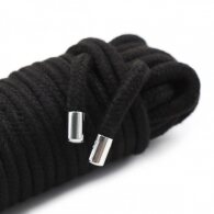 Βαμβακερό για να μήν αφήνει σημάδια, φετιχιστικό μαύρο σχοινή, είκοσι μέτρων, για μποντάζ δεσμά και δεσίματα bdsm παιχνίδια Naughty Toys. Υψηλής ποιότητας χοντρό (Ø 0.7 cm) βαμβακερό μαύρο σχοινί για φετιχιστικά μποντάτζ παιχνίδια και Ιαπωνικά δεσμά και δεσίματα. Στιβαρό, μεγάλης αντοχής μπλέξη, σχοινί με το οποίο θα μπορείτε άνετα να δέσετε ολόκληρο το σώμα χωρίς να αφήνει σημάδια η ακόμη δερματικούς τραυματισμούς. Σε κάθε πλευρά υπάρχουν μεταλλικά κλιπσάκια τα οποία αποτρέπουν την πρόωρη φθορά.