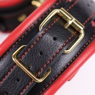 High Quality BDSM Gear and Restraints in Red Black and Gold metal. Special edition Red-Black Thick Leather Bondage Set - Collar with leash, Hand cuffs 2 Nipple Clips and chain clip BDSM. Complete high quality Black and Red leather Νeck Collar with leash with a matching pair of handcuffs, chained together with nipple clamps restraints.