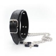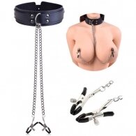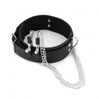 Φετίχ Μποντάζ δερμάτινο Κολάρο λαιμού με μεταλλικούς σφιγκτήρες θηλών. Το φετιχιιστικό παιχνίδι BDSM ακολουθεί μια πιο αργή, πιο σέξι προσέγγιση. Χτίζει ερωτική προσμονή, μπαίνει σε κάθε φυσική αίσθηση, παρατείνει την σεξουαλική εμπειρία και εντείνει την οργασμική απελευθέρωση. Unisex Bdsm Κολάρο με κλιπ θηλών Σκλάβας Σκλάβου. Ένα μέγεθος ρυθμιζόμενο μαύρο δερμάτινο κολάρο λαιμού με αλυσοδεμένους μεταλλικούς σφικτήρες κλιπσάκια με ελεγχόμενη ρύθμιση πίεσης στις θηλές. Τα δύο κλιπ συνδέονται με αλυσίδες σε έναν κεντρικό δακτύλιο το οποίο βρίσκεται στο κολάρο. Οι σφιγκτήρες είναι καλυμμένοι με προστατευτικά καλύμματα για την μέγιστη προστασία των θηλών.