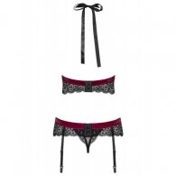 Σετ τριών τεμαχίων - σουτιέν μαύρης δαντέλας με σατέν κορδέλα που δένει στο λαιμό και κλείσιμο πολλαπλών θέσεων πίσω για τέλεια εφαρμογή, με βελούδινη λεπτομέρεια κάτω από το μπούστο. Ασορτί ζαρτιέρα με επίσης βελούδινη λεπτομέρεια στο πάνω μέρος, πόσο σέξι! Το σετ περιλαμβάνει το σουτιέν, τις ζαρτιέρες και το στρινγκ. Οι κάλτσες ΔΕΝ συμπεριλαμβάνονται. Όλα τα εσώρουχα Obsessive είναι ιδανικά για δώρο σε ειδικό χάρτινο πολυτελές κουτί.