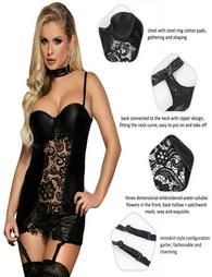 Μαύρο babydoll με ζαρτιέρες και με ασορτί g στρινγκ. Έχει μπαλένες, ρυθμιζόμενες τιράντες-ζαρτιέρες και περιλαίμιο που συνεχίζει στην πλάτη. Κλείνει με φερμουάρ και έχει άνοιγμα στην πλάτη. Στο μπροστινό μέρος έχει δαντέλα ενώ στην πίσω πλευρά έχει διαφάνεια.