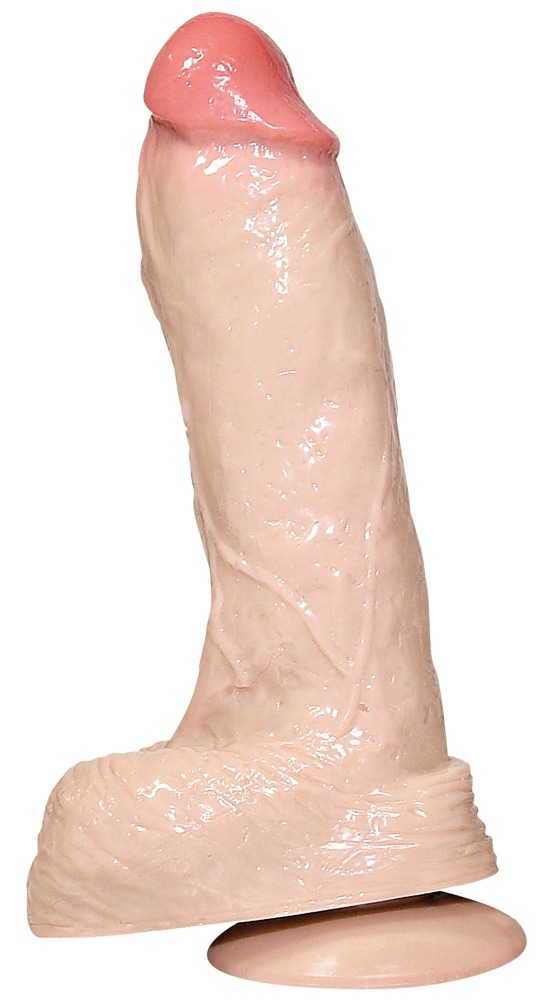Ένα ρεαλιστικό ομοίωμα σε σχήμα πέους με ανασηκωμένη ροζ βάλανο, έντονες φλέβες στον άξονα, όρχεις και βεντούζα στο χρώμα του δέρματος.