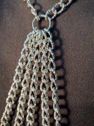 Χειροποιητο σύνολο απο αλυσίδες αλουμινίου ελαφριές, αρίστης ποιότητος. Από το λαιμό ξεκινούν 5 κάθετες αλυσίδες με ανοιχτή κατάληξη στη μέση. Ενα κόσμημα στο κορμί σας αφου οι αλυσίδες λαμπιρίζουν και τραβάνε τη ματιά του συντρόφου σας. Απο το λαιμό ξεκινούν 5 αλυσίδες και καταλήγουν ανοιχτά στη μέση. Μπορείτε να το φορέσετε και με ρούχα σερ ανάλογο ντύσιμο σε μία ιδιαίτερη έξοδό σας.