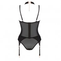 Ο μαύρος κορσές Brasica της Obsessive έχει ένα μινιμαλιστικό κόψιμο που συνδυάζεται με όμορφες λεπτομέρειες σε απόχρωση ροζ χρυσού. Πρόκειται για ένα εξαιρετικά κομψό σχέδιο, κατασκευασμένο από λεπτό πλέγμα, για πολλές καυτές περιστάσεις. Τα πλαϊνά του κορσέ διακοσμημένα με ρίγες θα τονίσουν υπέροχα τη μέση σας. Κουμπώματα με γάντζο, ασορτί σλιπάκι και ένα δαχτυλίδι κόσμημα στο λαιμό τα οποία θα ηλεκτρίσουν την ατμόσφαιρα.