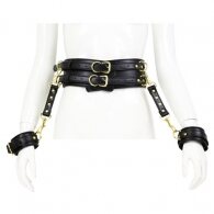 Fully adjustable black leather with gold metal bondage body waist corset with detouchable, matching set, wrist cuffs. Take your bdsm sex game to the next level.