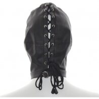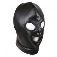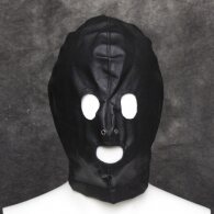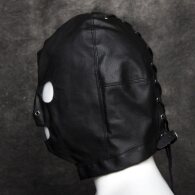 High quality full head cover, leather Hood mask with mouth, eyes openings by Naughty Toys. Unisex, one size with perfect fit. Made of high quality faux leather. Super sexy black mask with eyes and mouth openings. The back of the mask has got thin elastic bands that tie up the hood to your head.
