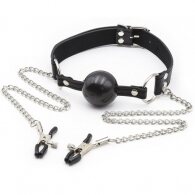 Must-to-have bondage gear accessory by Naughty Toys. A small to medium size Ø 4 cm, tpe black mouth gag with chained adjustable nipple clamps. Yes, you can apply on the nipples, as much pressure as you like. Adjustable PU leather collar. Ideal for both genders.