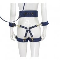 Fully adjustable, mysterious Tibet blue leather with gold metal bindings - bondage body waist corset with detouchable, matching set of wrist cuffs and thigh cuffs combined with a hog tie matching binder. Take your bdsm sex game to the next level.