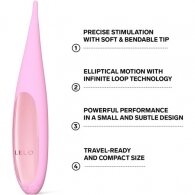 Χρησιμοποιώντας την τεχνολογία Infinite Loop, κινείται με συνεχή ελλειπτική κίνηση ενώ η απαλή και εύκαμπτη άκρη σας διεγείρει με απόλυτη ακρίβεια. Διαθέτει οκτώ μοτίβα ευχαρίστησης με ποικίλες εντάσεις, συσκευασμένα μέσα στο ασυνήθιστο σχήμα του. Το LELO DOT είναι ιδανικό για σόλο παιχνίδι αλλά και ζευγάρια που θέλουν να ζήσουν έναν διαφορετικό τύπο οργασμού.