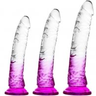 Τριπλό σετ ντίλντο με βάση βεντούζα, σε διαβαθμισμένο διάφανο/μωβ χρώμα και τρία μεγέθη: μικρό, μεσαίο, μεγάλο. Ιδανικό για απόλαυση χωρίς χέρια, φαντασιώσεις και παιχνίδι κάθε είδους. Κατάλληλο για γυναίκες και άνδρες, για κολπική ή πρωκτική χρήση. Απόλυτη ευελιξία για αρχάριους και έμπειρους.