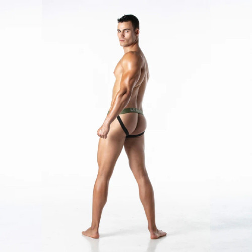 Black colour jockstrap in an elasticated jersey ribbed cotton fabric. Double layer pouch for a secure feel. Brushed elastic jacquard waistband. Embossed LEADER logo in the black leg elastic