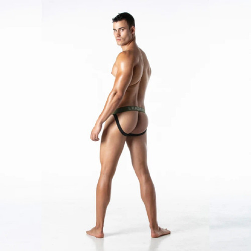 Khaki colour jockstrap in an elasticated jersey ribbed cotton fabric. Double layer pouch for a secure feel. Brushed elastic jacquard waistband. Embossed LEADER logo in the black leg elastic.
