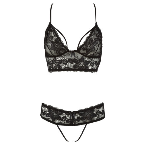 Sensual floral lace bralette with cups that can be unbuttoned. The back is in a captivating and elaborate racerback design. The matching string has an extra wide lace waistband. There are only two stretchy straps over the open crotch that highlight the most intimate parts.