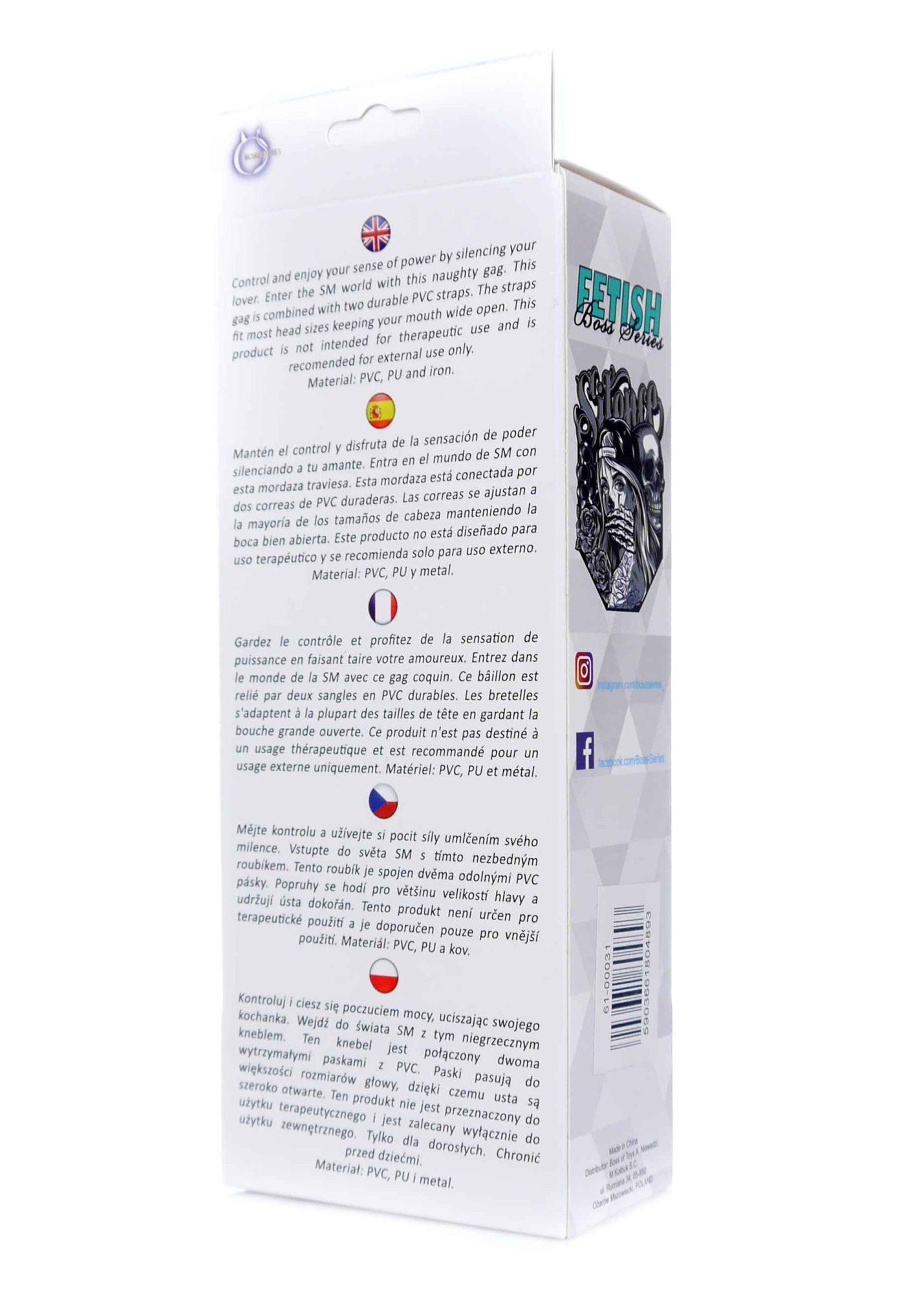 Η μπάλα είναι κατασκευασμένη από μαλακό καουτσούκ, έχει 3 τρύπες για να διευκολύνει την αναπνοή. Ο ιμάντας είναι ιδιαίτερα ρυθμιζόμενος και μπορεί να προσαρμοστεί σε οποιοδήποτε μέγεθος κεφαλής. Είναι κατασκευασμένο από μαύρο οικολογικό δέρμα.