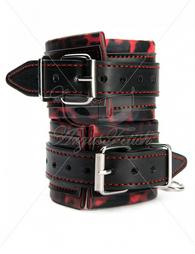 Οι κλασικές κόκκινες μανσέτες καρπού με λεοπάρ είναι κατασκευασμένες από δέρμα και εξαρτήματα χωρίς νικέλιο. Είναι άοσμα, πολύ ανθεκτικά για όλα τα είδη κρεβατιών. Η σύνδεση μεταξύ τους γίνεται μέσω δύο συνδετικούς κρίκους τα οποία μπορούν να αποσπαστούν και να συνδεθούν μεταξύ τους ή με κάτι χρησιμοποιώντας ένα σχοινί. Τα άκρα είναι ραμμένα με κόκκινη κλωστή, χάρη στην οποία θα είναι πολύ ανθεκτικά.