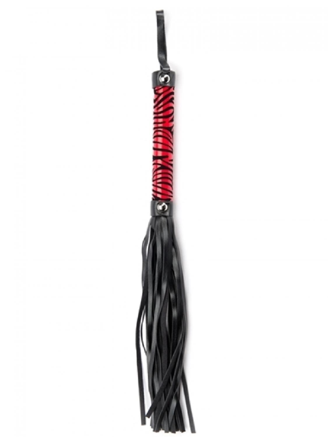 Κλασικό μαστίγιο από δέρμα PU, ξύλο και μέταλλο χωρίς νικέλιο με κόκκινη λεοπάρ. Η λαβή είναι σχεδιασμένη για τέλειο κράτημα και είναι πολύ ανθεκτική. Το μαύρο print στη λαβή είναι βελούδινο στην αφή, ενώ το κόκκινο μέρος είναι γυαλιστερό. Διαθέτει δερμάτινο δαχτυλίδι στο επάνω μέρος για αποθήκευση και εμφάνιση στόχων. Η διάμετρος του κουτιού είναι 25x8x4 εκ.