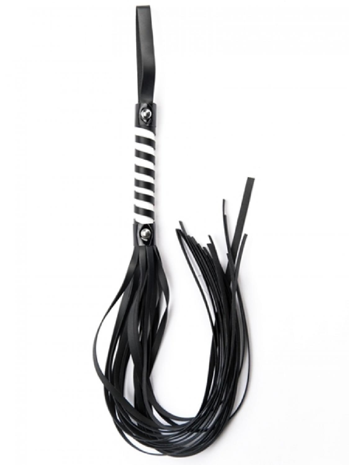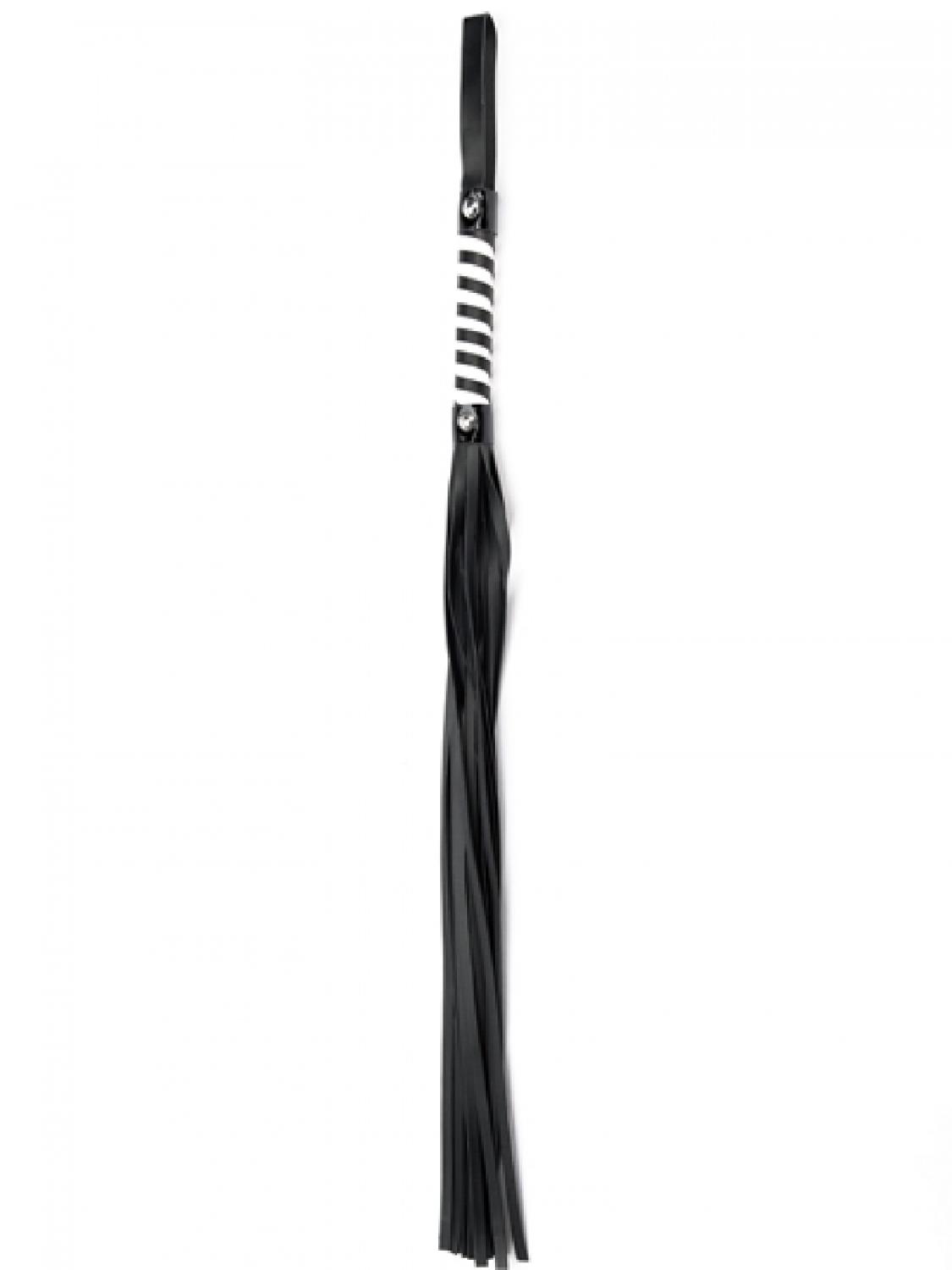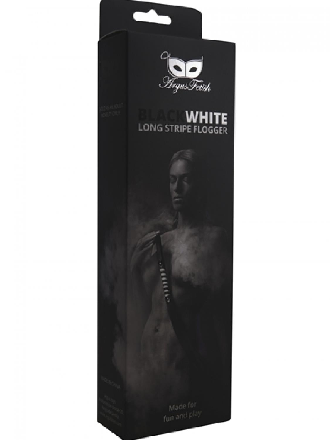 Μαύρο και άσπρο δέρμα PU flogger, διατίθεται σε λευκό με μαύρο δερμάτινο στέλεχος που περιστρέφεται σπειροειδώς γύρω από τη λαβή για καλύτερο κράτημα.  Κατασκευασμένο από PVC αυτό το μαστίγιο είναι ισχυρό και ανθεκτικό για κάθε είδους δραστηριότητα. Διαθέτει δερμάτινο δαχτυλίδι στο επάνω μέρος για αποθήκευση και εμφάνιση στόχων.