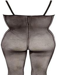 Ολόσωμη φόρμα από ελαστικό μαύρο πλέγμα με εκλεπτυσμένη οπτική γωνία ανοιγμάτων στα πλαϊνά. Προσκαλώντας ανοιχτό στον καβάλο! Με πόδι.