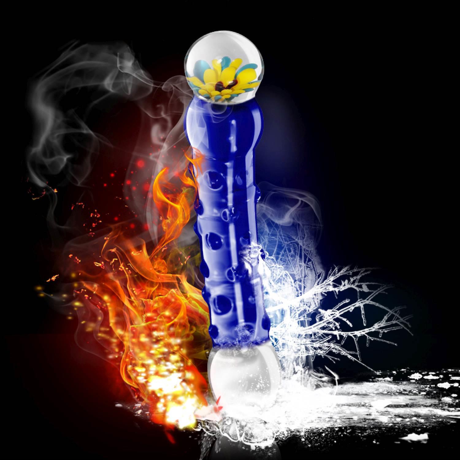 Πρακτικό και κομψό dildo σε μπλε χρώμα. Κατασκευασμένο από υψηλής ποιότητας γυαλί. Μπορεί να θερμανθεί ή να ψυχθεί. Συνολικό μήκος 19 cm, πραγματικό μήκος 16,5 cm, διάμετρος 3,3 cm.