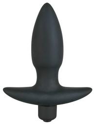 Μαύρο πρωκτικό βύσμα με δόνηση 5 σταδίων με το πάτημα ενός κουμπιού. Με λαβή επιστροφής. Συνολικό μήκος 13 cm, βάθος εισαγωγής 9 cm. διάμετρος 1,9 cm έως 2,7 cm. Υλικό: σιλικόνη. (Παρακαλούμε να παραγγείλετε μπαταρίες ξεχωριστά: 1 x Micro/AAA).