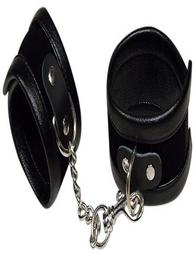 Όμορφες μαύρες χειροπέδες (24x5 εκ.) από απομίμηση δέρματος σουέντ. Οι μανσέτες έχουν κούμπωμα Velcro και κοντή συνδετική αλυσίδα με καραμπίνερ (περίπου 10 cm). Πολυουρεθάνη, μέταλλο.